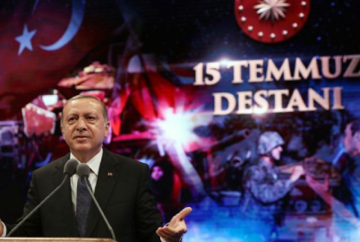 "BU NÖBETLERİ HER YIL TEKRARLAMAMIZ ÇOK ÖNEMLİ" Herkesi 1 yıl önce olduğu gibi illerin, ilçelerin meydanlarında hazırlanmış olan demokrasi nöbetlerine davet eden Erdoğan, "15 Temmuz'u unutmamak ve unutturmamak için bu nöbetleri her yıl tekrarlamamız çok önemli. Milletleri millet yapan, ilhamını tarihindeki dönüm noktalarından aldıkları bu tür gelenekler ve törenlerdir. Biz şuanda tarihi bizzat yaşadığımız için belki yeterince farkında değiliz ama gelecek nesillere çok önemli bir miras bırakıyoruz. 15 Temmuz'un ülke ve millet olarak bizim için ne anlama geldiği gelecekte çok iyi anlaşılacaktır. Tarihe not düşmek adına 15 Temmuz ile ilgili mümkün olduğu kadar çok bilimsel çalışma yapılmasını, hatıra bırakılmasını sağlamalıyız. Açılışını yaptığımız anıtlarla, başlattığımız anma programlarıyla, ilk raporunu yayınladığımız bilimsel araştırmalarla bu yolu açtığımıza inanıyorum. İnşallah bir makamı da anıtı da inşallah TBMM Külliyesi içinde gerçekleştireceğiz, projesi hazır. Gelecek yıllarda çok daha kapsamlı ve zengin programlarla bu önemli günü yad etmeyi sürdüreceğiz. Ülkemizin ve milletimizin bekasıyla ilgili aklından hala kötü niyetler geçenlere, geçirenlere ders niteliğinde olacak bu etkinliklere özellikle gençlerimizin sahip çıkmasını istiyorum" diye konuştu. Erdoğan, sözlerini bir şairin sözlerinden aldığı ilham ile bitirdi: "Selam olsun tanka karşı dimdik duran kahramanlara. Helal olsun bu yiğitleri doğuran eli öpülesi analara. Yazıklar olsun darbeye sevinen kanı bozuklara. Selam olsun Nene Hatunlara, Şerife Bacılara. Helal olsun Çanakkale ruhunu yaşatanlara. Yazıklar olsun vatan elden giderken kaçan korkaklara. Selam olsun ölüme meydan okuyan tüm canlara. Helal olsun darbeye darbe yapan korkusuzlara. Yazıklar olsun özgürlüğümüze kasteden alçaklara. Selam olsun 'kefenim sırtımda' diyerek yola koyulanlara. Helal olsun gövdesini kurşuna siper eden yiğitlere. Yazıklar olsun kendi milletine silah sıkan soysuzlara." (Derya Yetim - Cem Geçim /İHA)