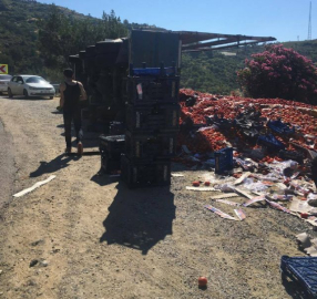 Mersin'in Anamur ilçesinde, 20 ton domates yüklü tır devrildi.