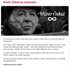 GALATASARAY "Türk sinemasının efsane isimlerinden Münir Özkul'un vefatını derin bir üzüntüyle öğrenmiş bulunuyoruz. Münir Özkul; bazen kahkahaların, bazen hüzünlerin başrolündeydi. Mahmut Hoca'ydı, Yaşar Usta'ydı, Rıza Baba'ydı, Baba Yaşar'dı... Kel Hasan Efendi'den İsmail Hakkı Dümbüllü'ye geçen kavuğun 1968'den Ferhan Şensoy'a devrettiği 1989 yılına kadar sahibiydi. 220 sinema filminde, 10 dizide rol alan, sayısız ödüllerin sahibi Münir Özkul eminiz ki Türk halkının kalbinde her zaman yaşayacak. 93 yaşında hayata veda eden Münir Özkul'a Allah'tan rahmet, kederli ailesine ve milletimize başsağlığı diliyoruz."