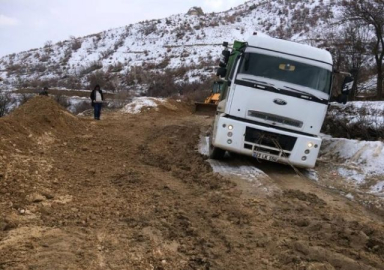 Traktörle denedik olmadı, kepçe getirdik olmadı çıkaramadık, Malatya'dan vinç getirdim. Vinçle çekip çamurda çıkardık yüz metre gitti yine çamura saplandı kaldı. Toprak malzeme yol kenarına yığılı halde üç aydır duruyor. Yem aracı dönüş yapıp yemi tekrar götürdü" diye konuştu.