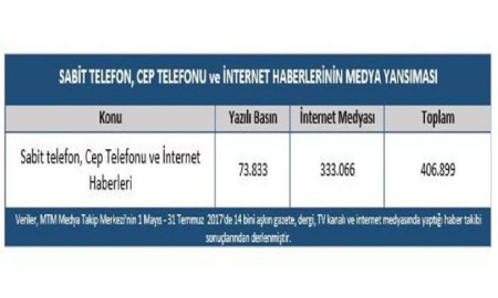 MTM'nin raporuna göre, 1 Mayıs - 31 Temmuz 2017 tarihleri arasında sabit telefon, cep telefonu ve internet hakkında yapılan haberlerin toplamı 406 bin 899 iken, bunun dağılımı ise yazılı basında 73 bin 833 ve internet medyasında ise 333 bin 66 şeklinde gerçekleşti.