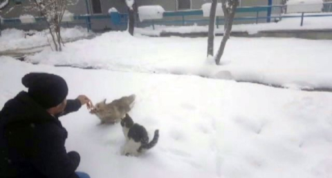 Sivas'ta etkisini sürdüren soğuk hava ve kar yağışı nedeniyle doğada yiyecek bulamayan tilki Kangal ilçesinde bulunan özel bir fabrikanın bahçesine girdi. Fabrikanın bahçesine giren tilki çalışanlar tarafından cep telefonu ile görüntülendi. Çalışanlar aç kalan tilkiyi et vererek ellleriyle besledi.