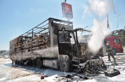 Edirne'nin Keşan ilçesinde, Keşan-Gelibolu kara yolundaki bir akaryakıt istasyonunda park yapan TIR'ın yanması sonucu olası bir faciayla karşı karşıya gelindi. İzmir'den yüklenen vitrifiye malzemelerini Sırbistan'a götürmek üzere Keşan-Gelibolu kara yolu üzerinde seyreden Darko Cırkovic (44), yönetimindeki NP 049 CW çekici ve AA 726 KA dorse plakalı TIR'ı, Mahmutköy kavşağı yakınlarındaki bir petrol istasyonuna park etti. Sürücü Cırkovic'in içecek almak için akaryakıt istasyonun marketine girdiği sırada, TIR'ın motor kısmı birden alev aldı. Alevlere ilk olarak istasyondaki araç yıkama bölümünde bulunan hortumlarla müdahale yapılırken, Keşan Orman İşletme Müdürlüğünün Korudağı Orman Yangın Müdahale ekibi ve Keşan Belediyesi İtfaiye Müdürlüğü ekipleri de kısa sürede yangın yerine gelerek söndürme çalışmalarında bulundu. Yangın, itfaiye ekiplerinin müdahalesi ile kısa sürede kontrol altına alınırken, TIR, içindeki vitrifiye malzemeleri ile birlikte yanarak kullanılamaz hale geldi. Yangında, akaryakıt istasyonu da zarar gördü. (Ayhan Gülver /İHA)