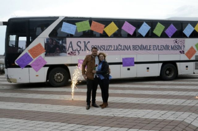 Zonguldak'ta yaşayan 29 yaşındaki Adem Karademir, yan bölümünü süslediği yolcu otobüsünün önünde kız arkadaşına evlenme teklifinde bulundu. Zonguldak kent merkezinde esnaflık yapan 29 yaşındaki Adem Karademir, 3 aydır birlikte olduğu kız arkadaşı 23 yaşındaki Şeydanur Hoşbaş'a evlilik teklifi için iki hafta öncesinden hazırlıklara başladı. Bir süre arkadaşlarıyla birlikte ilginç bir evlilik teklifi için fikir alışverişinde bulunan Karademir, "Aşk Otobüsü" yapmaya karar verdi. Kiraladığı yolcu otobüsünün yan bölmesine fon kartonlarıyla aşk sözleri yazan Karademir, 10 metre uzunluğundaki pankarta da "Aşk Sonsuzluğuna Benimle Evlenir Misin?" yazdırdı. Kendisini arayan Karademir'in yanına gelen kız arkadaşı Şeydanur Hoşbaş ise kendisi için hazırlanan sürpriz karşısında bir süre şaşkınlık yaşadı. Erkek arkadaşının "Benimle evlenir misin?" teklifine "Evet" yanıtını veren Hoşbaş, mutluluğunu erkek arkadaşına sarılarak paylaştı. Çift, bir süre otobüsün önünde dans etti. Sürprizi iki hafta öncesinden planladığını anlatan Adem Karademir, "Çok güzel bir duygu. Anlatamam. İki hafta öncesinden böyle bir sürpriz hazırlamıştım. Emeği geçen arkadaşlarıma teşekkür ediyorum" dedi. Çift, sürprizin hazırlanmasında destek olan arkadaşlarıyla otobüsün önünde hatıra fotoğrafı çektirmeyi de ihmal etmedi. (Onur Altındağ - Sertaç Özdemir/İHA)