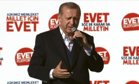 "Fakat yapacağımız daha çok iş var. 16 Nisan'da 'evet'le sandıkların patlaması lazım. Cumhurbaşkanı ve başbakan çekişmelerini yaşadık. Bu çekişmeler yaşanmasın istiyoruz. Onun için bu adımı atıyoruz. Demirel ve Özal'ın döneminde aynı şeyler yaşanmıştı. Sürekli sorun çıkartan aksıran tıksıran motorla yolunuza devam eder misiniz? İzmir, cumhuriyetini seviyor mu? 16 Nisan'da 'evet' diyecek mi? İzmir 16 Nisan'da halk oylamasında inanıyorum ki; 'evet' diyenleri buradan denize dökmekten bahsedenlere gereken dersi verecek mi?" Alanı dolduran vatandaşlar, Erdoğan'ın bu sözlerine "Evet" diyerek cevap verdi.