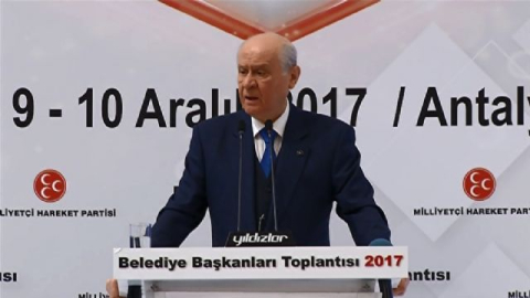 Antalya'da partisince düzenlenen belediye başkanları toplantısında konuşan Bahçeli, "Kudüs İslam'dır ve aynı zamanda Türklüğün derin izlerini taşımaktadır. Kudüs mukaddesatımızın namusudur. Gitti demekle gitmez, düştü demekle düşmez, İsrail'in demekle bu tartı bu sıkleti çekmez. ABD'nin marazi ve maceracı yönetimi Kudüs'ü İsrail'in başkenti olarak tanımıştır. Trump sorumsuz ve skandal bir karara imza atmıştır. ABD Başkanı bu hakkı nereden almaktadır? ABD Başkanı Ortadoğu ve hatta dünyanın dengeleriyle oynamaya nasıl kalkışabilmektedir? Tüm dünya, ABD'nin Kudüs kararına odaklanmıştır. Bölge barut fıçısıdır. Ortadoğu'daki istikrarsızlık daha da kemikleşip, daha da şiddetlenecektir. ABD Başkanı, barış diyor, Filistin'in haklarından bahsediyor. Yalan, dolan, riya ABD yönetimine egemen olmuştur. Kudüs'ün İsrail'in başkenti olarak tanınmasından sonra, bölgede barış ve işbirliğinden akıl sağlığı yerinde olan hiç kimse bahsedemeyecektir. Siyonizm'in lobi çalışması, Trump'a nüfuz faaliyetleri zehirli meyvesini vermiştir. Kudüs bizzat kriz havarisi, kaos imalatçısı Trump tarafından dinamitlenmiştir. Kıyamet günü senaryolarına derinlik katılmıştır. Evanjelist ve Kabala tezgahı Trump'ın iradesine zincir vurmuştur. ABD Senato ve Temsilciler Meclisi'nde 1995 yılında kabul edilen Kudüs'ün başkent olarak tanınmasıyla ilgili yasa bugüne kadar altı aylık periyotlarla ertelenmiş, buna gerekçe olarak güvenlik mülahazaları gösterilmişti. İç siyasette sıkışan, devamlı mevzi kaybeden, hakkındaki şayia ve şaibelerden dolayı zor günler geçiren Trump, 22 yıllık ertelemeyi bitirmiş, kampanya döneminde bedeli karşılığı verdiği çirkin sözü tutmuş, Kudüs'e adeta füze fırlatmıştır. Hakkındaki Rusya temalı iddiaların ensesinden tuttuğu da ortadadır. Bu iddiadan yakayı kurtarmak için Trump'un her çılgınlığı yapacağı, her şuursuzluğa hizmet edeceği muhtemeldir. Rusya'nın Orta ve Kısa Menzilli Füzeler Anlaşmasını ihlal ettiğini öne süren ABD Dışişleri Bakanlığı'nın, Moskova'nın buna son vermemesi halinde askeri ve ekonomik önlemler alacağını dün itibariyle duyurması yeni bir bunalımın ayak sesleridir. Yoğun istikrarsızlık kapıdadır. İslam âlemi infial halindedir. Üçüncü intifada çağrısı yapılmıştır. Dün medyaya yansıyan şiddet sahneleri, Cuma Namazı çıkışı protesto gösterileri, İsrail güvenlik güçlerinin acımasızca saldırıları önümüzdeki günlerin çok şeye gebe olduğunun habercisidir. Kudüs, ilk kıblemizdir; Miraç mucizesinin muazzez hatırasıdır. Üç dinin kesişme noktası olan Kudüs'ün İsrail'in başkenti olarak tanınması din savaşlarını tetikleyecek, husumet ve dehşet verici eylemler yer kürenin her yerine yayılabilecektir. Tehlike anormal boyuttadır. Felaket yanı başımızdadır. ABD, 1947 ve 1980 yıllarında alınanlar başta olmak üzere, Birleşmiş Milletler kararlarını hiçe saymış, uluslararası anlaşmaları inkâr etmiştir. Barış ve istikrar için, 1967 sınırları dâhilinde, başkenti Doğu Kudüs olan, bağımsız ve egemen bir Filistin devletinin kurulmasının önüne sürekli engeller çıkarılmaktadır. İsrail yangına körükle giderken, ABD bölgeyi ateşe vermek için harekete geçmiştir. Elbette, Kudüs'ün başkent olarak tanınması manen, vicdanen ve tarihen imkânsızdır. ABD'nin bu ısrar ve inadını çok kararlı bir şekilde kınadığımız herkesçe bilinmelidir. Türkiye'nin öncülüğünde, Sayın Cumhurbaşkanı'nın zirve başkanı sıfatıyla 13 Aralık 2017'de İstanbul'da gerçekleşecek İslam İşbirliği Teşkilatı toplantısı tarihi önemdedir. Bu toplantı mutlaka desteklenmelidir. 57 İslam ülkesi arasındaki ilişkiler güçlenmeli, bunlar gereken tavrını ABD'ye ve İsrail'e karşı mutlaka göstermelidir. Önemle diyorum ki, Filistin, başkenti Doğu Kudüs, bağımsız ve egemen bir devlet yapısıyla kabullenilmeli, tanınmalı, ilanı yapılmalıdır. Ayrıca Türkiye, Kudüs kararı geri çekilesiye kadar, İsraille diplomatik temsilcilik seviyesini en düşük noktaya indirmeli, hatta geçici olarak kapatmalıdır. İslam ülkeleri, İsrail'le kurulmuş siyasi, ekonomik ve diplomatik ilişkileri gözden geçirmeli, zorunluluk halleri dışında irtibat ve diyaloglar askıya alınmalıdır. Birleşmiş Milletler toplanmakla kalmamalı, kalıcı, etkili karar ve yaptırımları süratle alacak iradeyi sergilemelidir. Kudüs kutsalımız, kıvancımız, inancımızın emanetidir. Kudüs Müslümandır, mihverdir, müşrik ve batıl heveslere rehin ve teslim edilemeyecektir" diye konuştu.