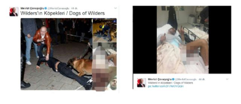 Dışişleri Bakanı Çavuşoğlu, Aile ve Sosyal Politikalar Bakanı Kaya'ya destek vermek isteyen Türk vatandaşlarına, Hollanda polisinin köpeklerle saldırdığı fotoğrafları resmi twitter adresinden yayınladı. Bakan Çavuşoğlu'nun 'Wilders'in Köpekleri Dogs of Wilders' başlığı ile yayınlamış olduğu fotoğraflarda, Hollanda polisinin Türk vatandaşların üzerine saldığı köpeklerin saldırısına uğrayan vatandaşlar yer alıyor.