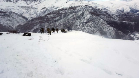 Bitlis'in Hizan ilçesinde yaşanan faciada çığ altında kalan son şehidin de cenazesi çıkarıldı. Hizan ilçesi kırsalında çığ düşmesi sonucu Van İl Afet ve Acil Durum (AFAD) Müdürlüğü ekipleri hemen helikopterle bölgeye sevk edildi. Burada çalışmalarını sürdüren AFAD ekibi, yaralı olarak kurtardığı askerleri helikopterle Bitlis-Tatvan Devlet Hastanesine sevk ettirdi. Mehmetçik ile birlikte bölgede çalışan AFAD ekibi, çığ altında kalan son şehidin cenazesini de kısa sürede çıkardı. (Vahit Olcay/İHA)