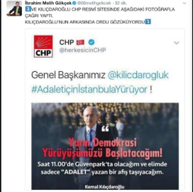Başkan Melih Gökçek, Twitter hesabından Kemal Kılıçdaroğlu'nun bugün Ankara Güvenpark'tan İstanbul'a doğru başlattığı 'Adalet Yürüyüşü'ne ilişkin CHP Genel Merkezi'nin resmi Twitter hesabından paylaşılan önde Kemal Kılıçdaroğlu, arkada ise flu şekilde üst rütbeli askerlerin bulunduğu fotoğrafın yer aldığı afişin gelen tepkiler üzerine CHP Genel Merkezi tarafından kaldırıldığını belirterek, söz konusu afişi paylaştı. Mesajlarına "Kemal Kılıçdaroğlu'na ve CHP'deki sağduyulu milletvekillerine tarihi ikaz" ifadesiyle başlayan Başkan Gökçek, Hürriyet Gazetesi Köşe Yazarı Abdulkadir Selvi'nin 5 Haziran'da yazdığı ve içinde "FETÖ'nün yeni bir darbe girişimi konusunda 15 Haziran tarihine dikkat çekilen" köşe yazısını paylaştı. "Kılıçdaroğlu, CHP resmi sitesinde aşağıdaki fotoğrafla çağrı yaptı. Kılıçdaroğlu'nun arkasında ordu gözüküyordu" mesajını fotoğrafla birlikte paylaşan Gökçek, "Bu fotoğraftakiler elbette Türk askeri değil, FETÖ askerleriydi. Kılıçdaroğlu tepkiyi gördü ve fotoğrafı kaldırttı" dedi.