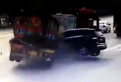 Çin'de ışık ihlali kazayla bitti. Hızla yola çıkan bir cip, akaryakıt tankerine çarptı. Kazada sürücüler hafif şekilde yaralanırken, tankerde büyük çaplı hasra oluştu. Tek teselli ise, tankerin boş olmasıydı.