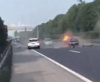 Kaza Çin'de meydana geldi. Sol şeritte duran otomobile, arkadan gelen bir cip çarptı.Kazanın etkisiyle araçlar savrulurken, otomobil alev aldı.O anlar kameraya böyle yansıdı.