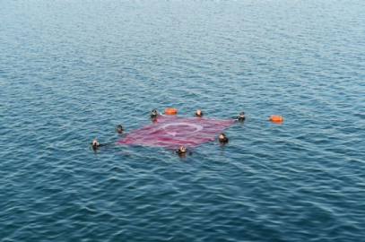 DALGIÇLARDAN MUHTEŞEM GÖSTERİ Feribot gezisinin Orhangazi sahilinden İznik sahiline doğru başlamasından yaklaşık 3 kilometre gölün açıklarında Orhangazi Belediyesi ve Mavi Keyif Dalış ve Cankurtaran Kulübü dalgıçları Türk Bayrağı ile birlikte gölün derinliklerine daldılar. Dalgıçların Türk Bayrağı ile birlikte su yüzüne çıkmaları ve ortaya çıkan görsel şölen feribot gezisine katılanlar tarafından ayakta alkışlandı. (Musa Öztürk/İHA)