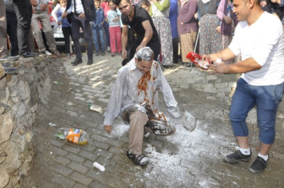 Manisa'nın Köprübaşı ilçesinde gerçekleştirilen düğün merasiminde, yıllardan bu yana gelen gelenek kapsamında damadın başından aşağıya ketçap, şampuan ve çeşitli içecekler döküldü. Adeta işkenceye dönüşen düğün eğlencesinde damada son olarak şınav çektirilerek ayva yedirildi.