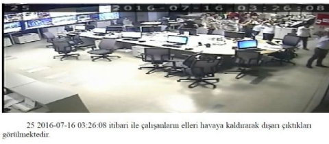 Şüphelilerin birinci katı gezip yayın odasını aramışlar, 'yayını kesin herkes binayı boşaltsın' şeklinde bağırdıkları, bu sırada yine çekim yaptığını gördükleri kamerama Ahmet Akpolat'a fiziki müdahalede bulundukları, engel olmaya çalışan Süleyman Sarılar' Erdal Şeker tarafından silah çekilerek 'Vururum seni' tehdidinde bulunduğu anlatıldı. Bina içinde yaşanan tartışmalar sırasında şüpheli Mehmet Akif Aslan'ın tabancası ile bir el havaya ateş açtığı, gazeteci Nedim Şener'in de askerlerle tartıştığı, canlı yayınlar da askerlerin yayını kesmeye çalıştığının bildirildiği, polisin binaya giriş yaptığı belirtilerek, "Şüpheli Erdal Şeker silahını vermemek için direnmiştir. Şeker'in silahını elinden almak istediği sırada mağdur polis memuru Tansu Tan elinden yaralanmıştır. Polis ekiplerinin ve vatandaşlarımızın gayretleri sonucu şüpheliler etkisiz hale getirilmiştir" denildi.