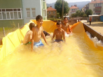 Evlerinin önünde duran traktör römorkunu havuza çevirerek serinlemeye çalışan çocuklar, çevredeki vatandaşların ilginç bakışlarına aldırış etmeden hem serinliyorlar hem de eğleniyorlar.
