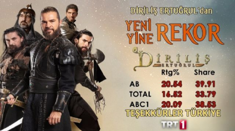 TRT 1'in reyting rekortmeni dizisi Diriliş Ertuğrul, 98. bölümüyle tarihi bir rekora daha imza attı. 96. bölümüyle Total'de 16.40, AB'de 20.53 ve ABC 1'de 20.32 reyting oranları alarak bugüne kadar TV'de bir yapımın aldığı en yüksek reyting oranlarına sahip olan Diriliş Ertuğrul, 98. bölümüyle Total'de 16.52, AB'de 20.54 ve ABC 1'de 20.09 reyting oranları alarak kendi rekorunu kırdı. Proje tasarımını, yapımcılığını ve senaristliğini Mehmet Bozdağ'ın üstlendiği, yönetmenliğini Metin Günay'ın yaptığı, başrollerini Engin Altan Düzyatan, Hülya Darcan ve Esra Bilgiç'in paylaştığı Diriliş Ertuğrul kendi rekorunu yeniledi. Turgut Alp ve Aslıhan Hatun'un zehirlenerek ölüm döşeğine düştüğü, Ertuğrul Bey ve Alplarının panzehir arayışlarıyla ve yüksek gerilimli sahneleriyle izleyicileri bir kez daha ekrana kilitlemeyi başardı. Dizinin 98. Bölümü AB'de 20.54, ABC 1'de 20.09 ve TOTAL'de 16.52 reyting oranlarıyla bir kez daha kendi rekorunu kırdı. Bu oranlara göre önceki akşam iki kişiden biri yeniden Diriliş Ertuğrul'u izlemiş oldu.
