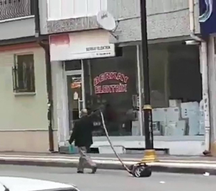 Elektrikli süpürgeyi sokakta gezdirdi
