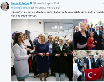 Cumhurbaşkanı Erdoğan'ın eşi Emine Erdoğan, dün açılan resmi Twitter hesabından ilk paylaşımını yaptı. İlk paylaşımında Cumhurbaşkanı Erdoğan'ın dün sona eren resmi Sırbistan ziyaretinden ve Sırbistan'da Türkiye'nin destekleriyle açılışı yapılan projelerden fotoğraflara yer veren Erdoğan, "Sırbistan ziyaretimiz, Balkanlardaki kardeşlerimizle bir kez daha kucaklaşmamıza, hasret gidermemize vesile oldu. Türkiye'nin de destek olduğu projeler, Balkanlar ile aramızdaki gönül bağını inşallah daha da güçlendirecek" ifadelerini kullandı.