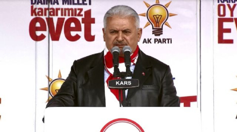 "15 YILDA BİR TÜRKİYE 3 TÜRKİYE OLDU" Halk oylamasının önemini anlatan Başbakan Yıdırım, "Darbe anayasası bu oylama ile çöpe gidecek. Vesayet gidecek. Halkın oylaması hakim olacak. Şimdi söz de sizin karar da sizin. Kararınız evet mi? Türkiye'nin geleceğine karar vermeye var mısınız? Türkiye'yi daha da büyütmeye hazır mısınız? 15 yıldır Türkiye çok şey kazandı, bu kazanımları devam ettirmeye var mısınız? Kars bitirmiş işi. Kars var olasın Kars. Kars'ın kararı Türkiye'nin kararıdır. 15 yılda bir Türkiye 3 Türkiye oldu. Milli gelirimiz arttı. Türkiye son çeyrekte yüzde 3,5 büyüdü. Dünya ortalamasının yüzde 50 fazlası oldu. İşte Türkiye işte Kars. Son 15 yılda ayrılıkları gayr ılıkları kaldırdık. 80 milyonu kardeş bildik. Bakın buradan söylüyorum yerli olun, Terekeme olun, Kürt olun kimliğinizle gurur duyun. Türkiye'yle gurur duyun. Bütün saçma sapan yasakları kaldırdık. Artık paralat IMF'ye gitmiyor. Eğitime, yollara, tarıma, hayvancılığı, kalkınmaya gidiyor. Hayal bile edilen projeleri birer birer yaptık hizmetinize sunduk" diye konuştu. "Biz sadece yaradanın huzurunda eğiliriz" diyen Başbakan Yıldırım, "Türkiye'yi hızlı trenle tanıştırdık. Yolları böldük gönülleri birleştirdik. Yolları böleriz de Türkiye'yi asla böldürmeyiz. Artık dışarıya silah için, mühimmat için paraları göndermeyeceğiz. Paralar Kars'ın, Batman'ın, Edirne'nin yatırımları için harcanacak" dedi.