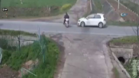 Korkunç kaza Çin'de gerçekleşti. Motosikletli yola kontrolsüz çıkınca kaza da kaçınılmaz oldu. Hızlı gelen otomobil motosikletle çarpıştı. Çarpışmanın şiddetiyle yere çakılan sürücü yanındaki ağır yaralı olarak hastaneye kaldırıldı.