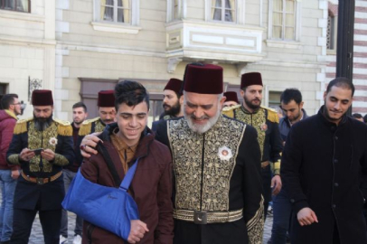 "BÜTÜN KÖTÜLÜKLERE RAĞMEN ONLARIN ORADA BU DİRENİŞİ GÖSTERİYOR OLMASI GURUR VERİCİ" Dizinin Tahsin Paşa'sı Bahadır Yenişehirlioğlu, "Kardeşimizin bugün aramızda olması bizi çok mutlu etti. Biz kendisini bütün dünyaya lanse ettiği fotoğrafla tanıyoruz. O fotoğrafı yüzlerce kez paylaştık. O fotoğraf bir kahramanlığı ortaya koyuyordu. İsrail'in zavallılığını, yalnızlığını ve acziyetini ortaya koyuyordu. Bu yaştaki bir delikanlının etrafını sara İsrail askerlerinin ne denli panik halinde olduğunu gösteriyordu. Filistin bizim için vazgeçilmez. Çünkü orası bizim kırmızı çizgimiz. Orası bizim ilk kıblemiz. Oradaki kardeşlerimiz ile tarihi dini ve milli bağlarımız var. Bugün bizim canlandırdığımız Abdülhamit dönemini kardeşimiz ne kadar güzel ifade etti. Bu tarihi bağlar bizi birbirimize bağlıyor. Bütün kötülüklere rağmen onların orada bu direnişi gösteriyor olması gurur verici" ifadelerini kullandı. Daha sonra Fevzi el-Cüneydi ve dizi de rol icabı Abdülhamit Han'ın askerlerini oynayan oyuncular İsrailli askerlerin fotoğrafına tepki olarak kol kola yürüdüler. (Oğuzhan Eke - Uğur Konuk/İHA)