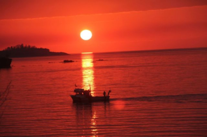 Giresun'da gün batımı dakikalarında, bulutların da farklı bir güzellik kattığı renk cümbüşüne balıkçı tekneleri de eşlik edince görsel bir tablo ortaya çıktı. Sahilden yaklaşık bir buçuk kilometre mesafedeki ada ise gün batımına bir inci gibi eşlik etti.