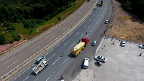 Jandarma ekipleri İstanbul'da Şile yolu üzerinde hafriyat kamyonlarına yönelik uygulama yaptı. Ekiplerin drone kullanarak yaptığı uygulama, havadan görüntülendi.