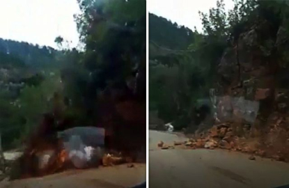 Alanya merkeze 7 kilometre uzaklıkta bulunan Değirmendere Mahallesi yolunda etkisini artıran şiddetli yağış nedeniyle dün öğle saatlerinde heyelan meydana geldi. O sırada yolda olan bir vatandaş yola küçük taş parçalarının düştüğünü görünce aracını yaklaşık 5 metre yakında durarak cep telefonu ile çekim yapmaya başladı. Vatandaş, kısa süre sonra büyük bir gürültüyle dev kayaların yola düştüğü anı aracının içinden saniye saniye görüntüledi.