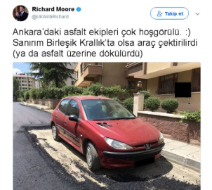 İngiltere'nin Ankara Büyükelçisi Richard Moore sosyal medya hesabı Twitter üzerinden aracının fotoğrafını paylaştı. İngiltere'nin Ankara Büyükelçisi Richard Moore sosyal medya hesabı Twitter üzerinden aracının fotoğrafıyla birlikte, "Ankara'daki asfalt ekipleri çok hoşgörülü. :) Sanırım Birleşik Krallık'ta olsa araç çektirilirdi (ya da asfalt üzerine dökülürdü)" yazısını paylaştı. Moore, bu paylaşımını hem İngilizce hem Türkçe yaptı. Moore'un paylaştığı fotoğrafta aracının bulunduğu bölüm dışındaki bütün yolun asfaltlandığı gözüküyor.