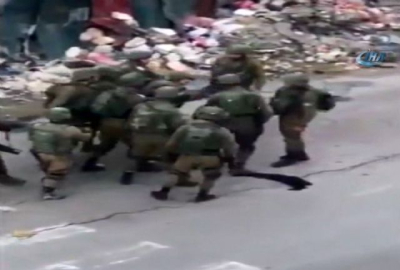 Bir başka video görüntüsünde yine İsrail askerleri Batı Şeria'da bir Pazar yerinde Filistin'li bir genci gözaltına alırken önce yere yatırıp hareketsiz hale gelinceye kadar yumrukluyor, ardından bileklerine kelepçe takıyor.