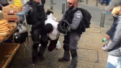 İşgalci İsrailli askerlerin Kudüs'te bacağı kırık genç bir Filistinliyi yaka paça götürürken görüldüğü video büyük tepki çekti.