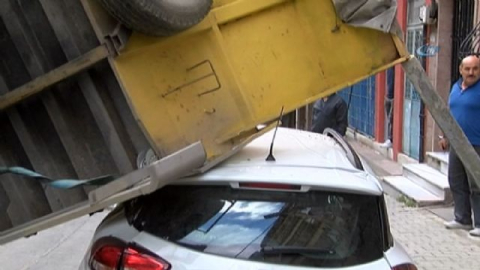Kağıthane Çağlayan'da sokak arasındaki inşaata yanaştığı esnada damperini kaldırarak dönmeyene çalışan demir yüklü kamyonet, park halindeki otomobilin üzerine devrildi. Kazada şans eseri ölen ya da yaralanan olmazken, otomobil sahibi 5 dakikayla ölümden kurtulduğunu söyledi.