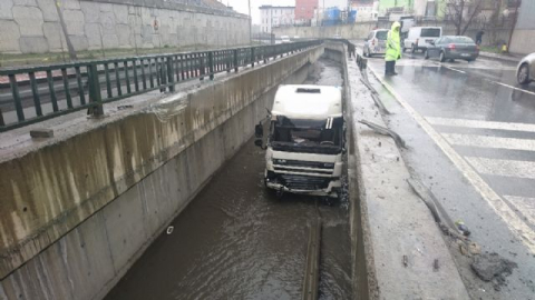 İstanbul Başakşehir'de yağış ve aşırı hız nedeniyle kontrolden çıkan tır önce bariyerlere çarptı ardından dereye uçtu. Kazanın olduğu bölgede çift şeritli yolun tek şeridi trafiğe katıldı.