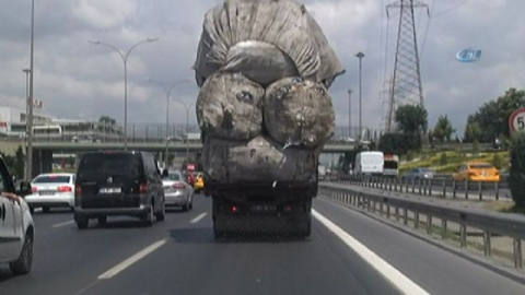 Kamyonun kasasına geri dönüşümde kullanılan plastik malzemeleri yükleyen kamyon sürücüsü görenlere bu kadarına da pes dedirtti. Kamyon kasasında metrelerce yükselen plastik malzemeler sürücülerin hayatını tehlikeye attı. Yolda bulunan üst geçit ve trafik yön levhalarını teğet geçen kamyon faciaya davetiye çıkarırken yaşanan anlar saniye saniye cep telefonu kameralarına yansıdı. Basın Ekspres karayolunda çekilen görüntülerde, kamyonun akan trafikte metrelerce yükselen yüküyle birlikte hızla seyir aldığı görülüyor.