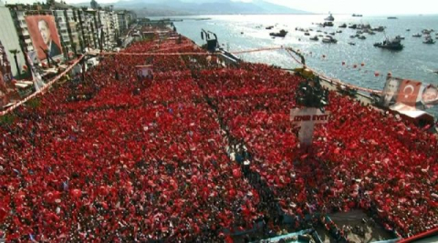 CUMHURBAŞKANI ERDOĞAN Saha sonra kürsüye büyük bir coşku eşliğinde Cumhurbaşkanı Erdoğan geldi. Tarihi kalabalığa teşekkür eden Erdoğan, "İzmir, kendisini çantada keklik görenlere rekor bir evetle cevap vermeye hazır mı.? Bugün bir başka kararlılık görüyorum. 16 Nisan tarihi bir dönüm noktası olacak" dedi.