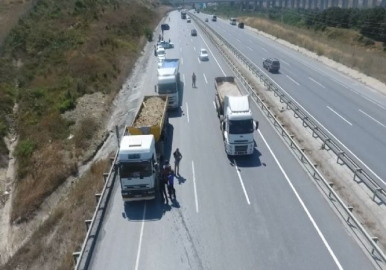 Jandarmanın hafriyat kamyonlarına yönelik uygulaması havadan görüntülendi