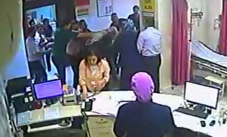 Birecik Devlet Hastanesinin acil servisinde görevli kadın doktor ve stajyer hemşirenin, hasta ve yakınları tarafından darp edilmesi, güvenlik kamerasına yansıdı.