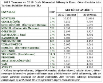 Maliye Bakanlığı kamu çalışanları ve emekli maaşlarına getirilecek zam oranlarıyla ilgili açıklama yaptı. Bakanlık açıklamasına göre, 2018 yılı Ocak ayından geçerli olmak üzere, kamu görevlileri ile memur emeklilerinin tamamının maaş ve ücretlerinde yüzde 4 oranında artış öngörülmüştü. 2017 yılı ikinci altı aylık döneminde enflasyon yüzde 5,69 gerçekleşti. Gerçekleşen bu enflasyon oranından kaynaklı olarak ilave yüzde 1,69 artış ile birlikte kamu çalışanlarının aylık ve ücretlerinde ocak ayından geçerli olmak üzere toplamda yüzde 5,69 oranında artış yapıldı. Bu çerçevede aile yardımı ödeneği dahil en düşük memur maaşı 2 bin 721 TL'den 2 bin 893 TL'ye yükseldi.