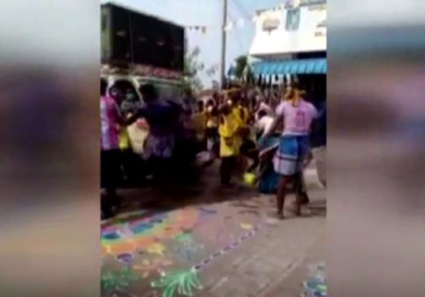 Hindistan'da sokak ortasında dans eden bu grup, başlarına gelecek inanılmaz kazadan habersiz eğleniyordu. Az sonra sürücüsünün kontrolünden çıkan kamyonet kalabalığın arasına daldı. Çarpmanın etkisiyle gruptakiler sağa sola savrulurken, çok sayıda kişinin yaralandığı kaza cep telefonu kamerası tarafından görüntülendi.