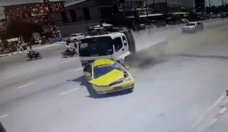 Dehşete düşüren kaza Tayland'da meydana geldi. Kırmızı ışıkta bekleyen taksiye, hemen arkasından süratle gelen bir kamyonet çarptı. Önüne aldığı aracı metrelerce sürükleyen kamyonet, bir iş yerine daldıktan sonra durabildi. Kazada 5 kişinin hayatını kaybettiği açıklandı.