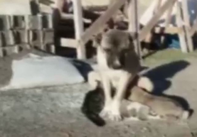 Erzincan'ın Tercan ilçesi Gevenlik köyünde 2 yavrusu bulunan bir kangal çoban köpeği, annesi ölen kediyi sahiplendi.