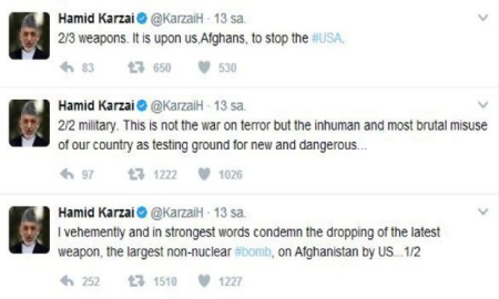 Afganistan eski Cumhurbaşkanı Karzai, twitter hesabından yaptığı paylaşımda, ABD'yi kınadığını duyurdu. Karzai paylaştığı 3 tweet'inde, "Afganistan'da nükleer olmayan dünyanın en büyük bombasının kullanılmasını şiddetle kınıyorum. Bu teröre karşı savaş değil, ülkemiz ağır silahların test edildiği bir ülke değil, bu insanlık dışı bir olaydır" paylaşımında bulundu.