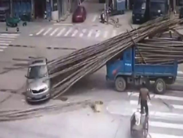 Sürücü ve yanındaki kadın bu kazadan yara almadan kurtuldu. İnanılmaz kaza Çin'de gerçekleşti. Ara sokaktan çıkan otomobil, caddeye girmek üzereydi. Bu sırada bambu kamışı yüklü kamyon, bir anda durunca tonlarca ağırlığındaki kamışlar otomobile ok gibi saplandı. Otomobil sürücüsü ve araçtaki kadının yara almadan atlattığı kaza güvenlik kamerası tarafından görüntülendi.