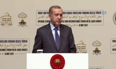Cumhurbaşkanı Recep Tayyip Erdoğan, Kudüs'e sahip çıkmanın her Müslüman'ın görevi olduğunu belirterek, "Kudüs'ün tekrar barış, huzur ve güven şehri olması için gayret sarf ediyoruz. Ümmetin ilk kıblesi, peygamberler şehri olan Kudüs; tüm Müslümanların harem-i izzeti ve namusudur" dedi. Cumhurbaşkanı Recep Tayyip Erdoğan, Vakıf Haftası ve Uluslararası Kudüs Vakıfları Forumu açılışına katıldı. Haliç Kongre Merkezi'nde düzenlenen toplantıda konuşan Erdoğan, "Gerektiğinde evladı için vücudunu kahpe kurşunlarına siper eden Filistin'in fedakar babalarını selamlıyorum. Evinden barkından edilmiş, kimi vatan hasretiyle hayata veda etmiş 8 milyon Filistinli kardeşime selamlarımı ve dualarımı gönderiyorum. Hangi dinden, milletten olursa olsun Kudüs için mücadele eden, Filistin'deki adaletsizliği ve işgali gidermek için çaba harcayan tüm vicdan sahiplerine saygılarımı yolluyorum" dedi. "Biz Mescid-i Aksa dediğimiz zaman onu orada Harem-i Şerif olarak ifade etmeyi eksik görüyoruz. Kubbet-üs Sahra'da hepsi içindedir. Kimse kimseyi aldatmasın. Bunun mücadelesini bütünüyle bu şekilde veriyoruz" diyen Cumhurbaşkanı Erdoğan, "Kudüs 3 semavi din için de kutsal bir şehirdir. Bütün insanlık tarihinin özüdür, özetidir. Filistin'in milli şairi merhum Mahmut Derviş, 'Kadim surlar içinde yürüyorum Kudüs'te, bir zaman diliminden diğerine' dizeleri ile Kudüs'ün bu vasfını çok güzel anlatır. Nuri Pakdil de Kudüs'ün zamanı ve mekanı aşan önemini kelimelere şöyle döker; 'Tur Dağı'nı yaşa ki, bilesin nerede Kudüs. Ben Kudüs'ü kol saati gibi taşıyorum. Ayarlanmadan Kudüs'e boşuna vakit geçirirsin, buz tutar gözün, görmez olur. Kudüs'te zaman bizim bildiğimiz vakitlere göre değil, kendi mecrasına akar. Kudüs aşktır, hasrettir. İnsanlığın gönlünün nuru, gönlünün sürurudur. Kudüs yeryüzünde arşı alaya en yakın yerdir. Çünkü Kudüs İsra'nın ikinci durağı, miracın ilk basamağıdır. Kudüs tüm Müslümanların harem-i izzeti ve namusudur. Burada bizlere pusula olması için bir hadisi şerifi nakletmek isterim. Bir gün Hz. Meymune, Peygamber Efendimize Mescid-i Aksa için 'Hüküm nedir?' diye sorar. Bunun üzerine Efendimiz, 'Oraya gidin ve orada namaz kılın' buyurur. Hz. Meymune tekrar sorar; 'Gidemezsek ne yapmamız gerekir?' Efendimiz o zaman kandillerinde yakılmak üzere yağ gönderin der. Efendimiz bir başka hadislerinde yolculuk yalnız üç mescidedir, Mescid-i Haram, Mescid-i Nebevi ve Mescid-i Aksa'dır diye buyurmuşlardır" dedi.
