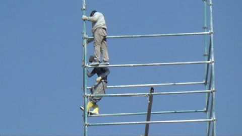 Adıyaman'da bir cami inşaatında çalışan 2 işçi herhangi bir güvenlik önlemi olmadan metrelerce yükseklikteki iskelede çalışıyor. Turgut Reis Mahallesi'nde bulunan ve yapımı devam eden Hastane Cami inşaatında 2 işçi, herhangi bir güvenlik önlemi almadan metrelerce yükseklikteki iskelede çalışıyor. Çevredeki vatandaşların şaşkın bakışları arasında tehlikeyi hiçe sayan işçiler, demir borular üzerinde yürürken zaman zaman yürekleri ağza getiriyor. İşçiler bir elliyle demir borulara tutulurken bir yandan da ellerindeki keserlerle çalışmalarına devam ediyor. (Cihan Kizir /İHA)