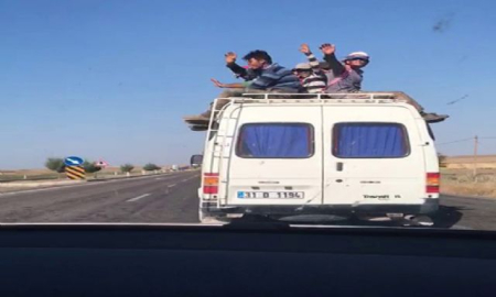 Hatay'da bir otoyolda seyir halindeki bir sürücü tarafından kaydedilen görüntülerde seyir halindeki bir minibüsün üstünde yaklaşık 10 mevsimlik işçinin seyahat ettiği görülüyor.