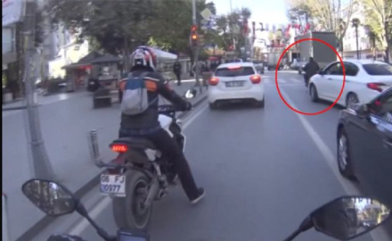 Kameralara yansıyan başka bir görüntüde ise Kadıköy Bağdat Caddesi'ndeki kırmızı ışığın yanmasıyla duran motosiklet sürücüsünün başına hiç ummadığı bir olay geldi. Yeşil ışığın yanmasını bekleyen sürücüye o esnada arkasında otomobil çarptı. Çarpmanın etkisiyle motosiklet devrilirken, sürücüsü dengede kalmayı başardı. Motosikleti bacaklarının arasında kalan sürücü görenleri güldürürken, bir o kadar da korkuttu. Yaşanan olaylar ise kameralara yansıdı.