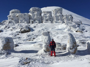 Devasa heykellerin kar, tipi ve soğuk ile birlikte buz kestiği, tipi nedeniyle beyaza bürünen heykeller kartpostallık görüntü oluşturduğu görüldü. Geceyi zirvede geçiren dağcılar tekrar 5 saat süren bir yolculuktan sonra tekrar Arsemia bölgesine ulaştı.