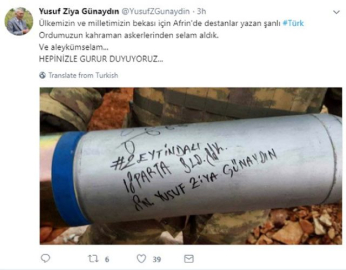 "HEPİNİZLE GURUR DUYUYORUZ" Operasyondaki bir obüs mermisi, üzerine çizilen zeytin dalı figürü ile "Isparta Belediye Başkanı Sn.Yusuf Ziya Günaydın" yazılarak Başkan Günaydın'a gönderildi. Başkan Günaydın da kendisine selam gönderilen o fotoğrafı twitter hesabından paylaşarak, "Ülkemizin ve milletimizin bekası için Afrin'de destanlar yazan şanlı Türk ordumuzun kahraman askerlerinden selam aldık. Ve aleykümselam. Hepinizle gurur duyuyoruz" notunu düştü.