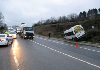 Beykoz'da tansiyonu düşen okul servisi şoförü direksiyon hakimiyetini kaybetti. Araç yol kenarındaki boşluğa düşerken öğrencilerin kazadan zarar görmediği öğrenildi.